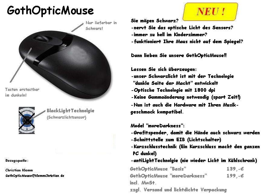 GhostOpticMouseDer Vassi von Murder.Inc meinte ich solle doch auch mal eine dunkle Optische Maus entwickeln, das helle Licht nervt ihn immer. Wir entwickelten also diese Maus die mit dem Schwarzlichtsensor arbeitet!